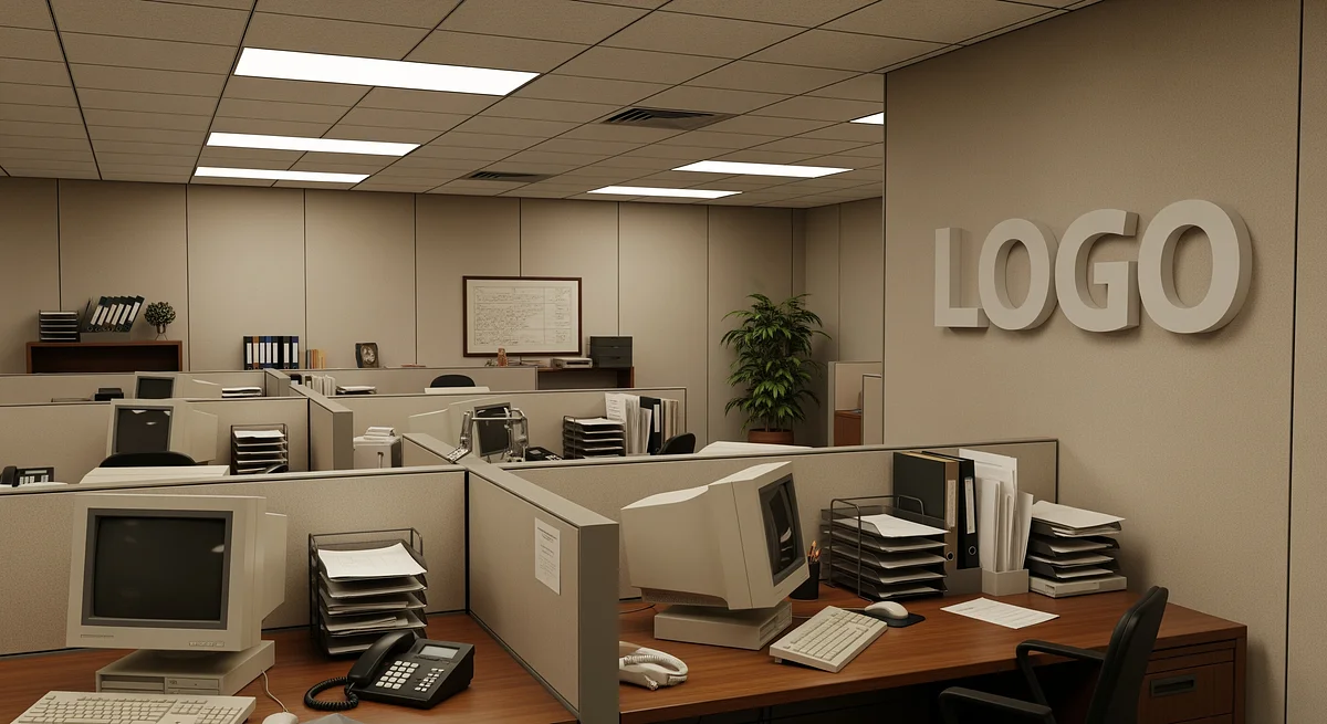 A nostalgic 1990s office setting with a professional wall-mounted 3D logo as the focal point.